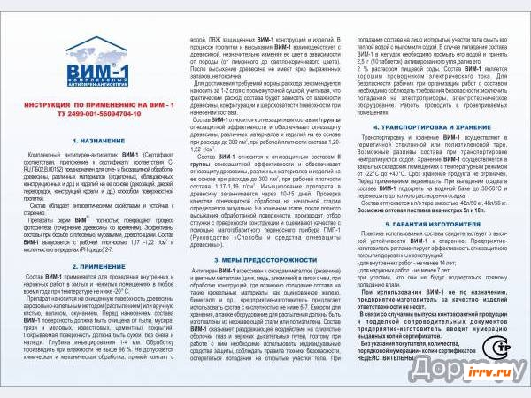 ВИМ-1 предназначен для огне-биозащитной обработки древесины, различных материалов (отделочных, облицовочных, конструкционных и др.) и изделий на ее основе (декораций, дверей, перегородок, конструкций кровли) способом поверхностной пропитки. Составы серии ВИМ-1 выявляют структуру древесины, придают цвет от светло-лимонного до светло-коричневого в зависимости от показателя рH-среды. Полностью прекращают фотосинтез (почернение древесины со временем). Эффективны составы при борьбе с плесенью, муравьями, древоточцами. Одним из главных преимуществ составов является возможность нанесения в любое время года при температуре окружающей среды не ниже -20 градусов по цельсию.